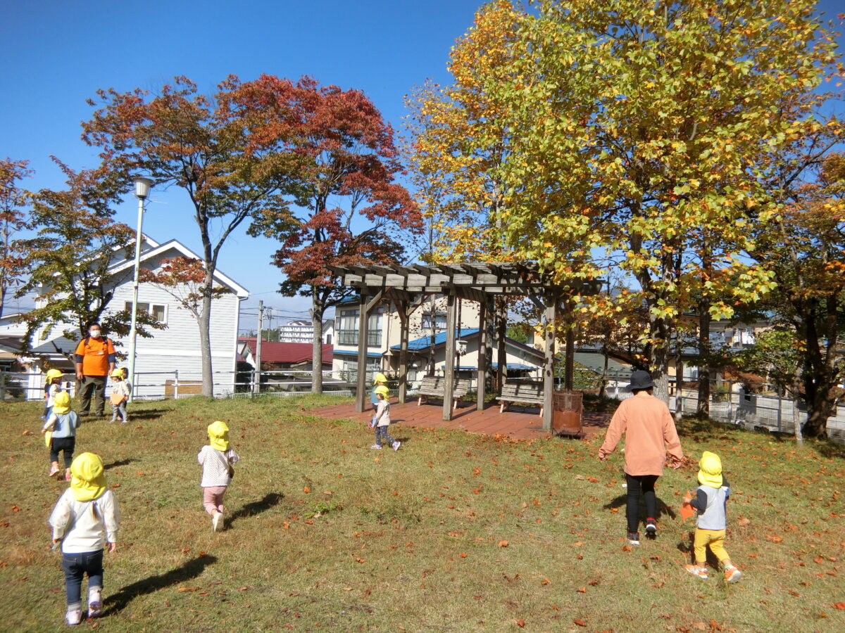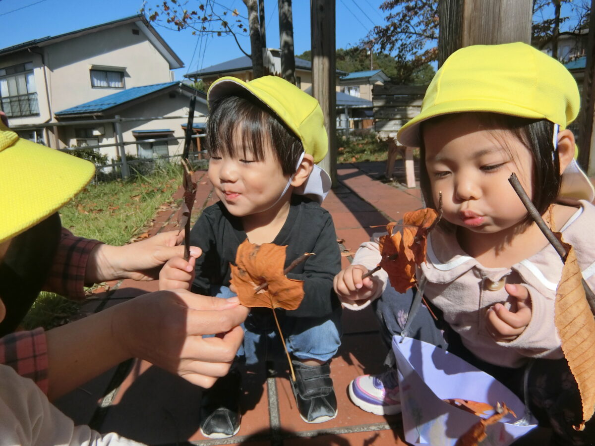 赤や黄、茶色に変色した落ち葉を拾っては、友だちと見せ合いっこを楽しんでいました。