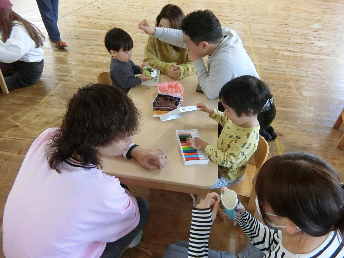 子どもたちがホールへ入場し、まずは親子で手作りおもちゃ作り♪