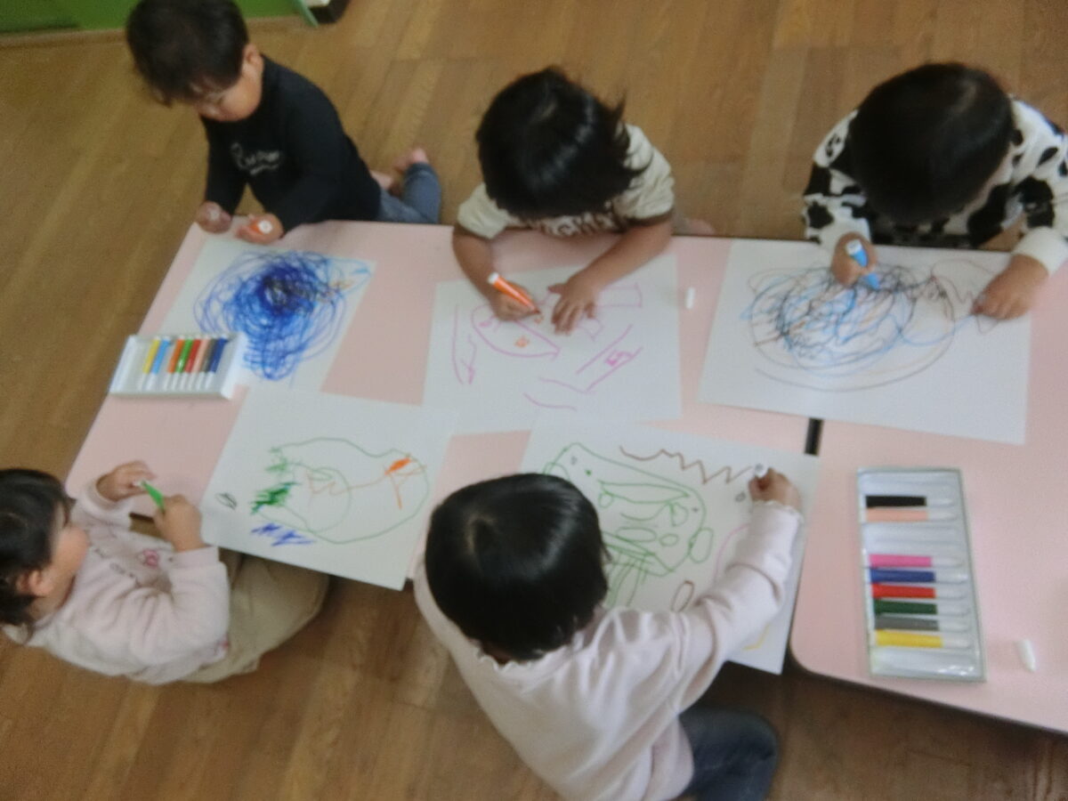 ペンを握り、自由にお絵描き。大きく大胆に描く子、細かく手先を動かし描く子、色に関心を示しこだわる子、などなど、楽しみ方は様々です。顔を描く子も出てきました!!