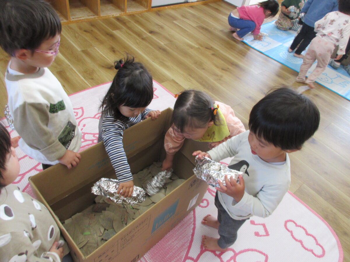 自分たちでアルミホイルを巻いて、葉っぱの入ったダンボールへ…。