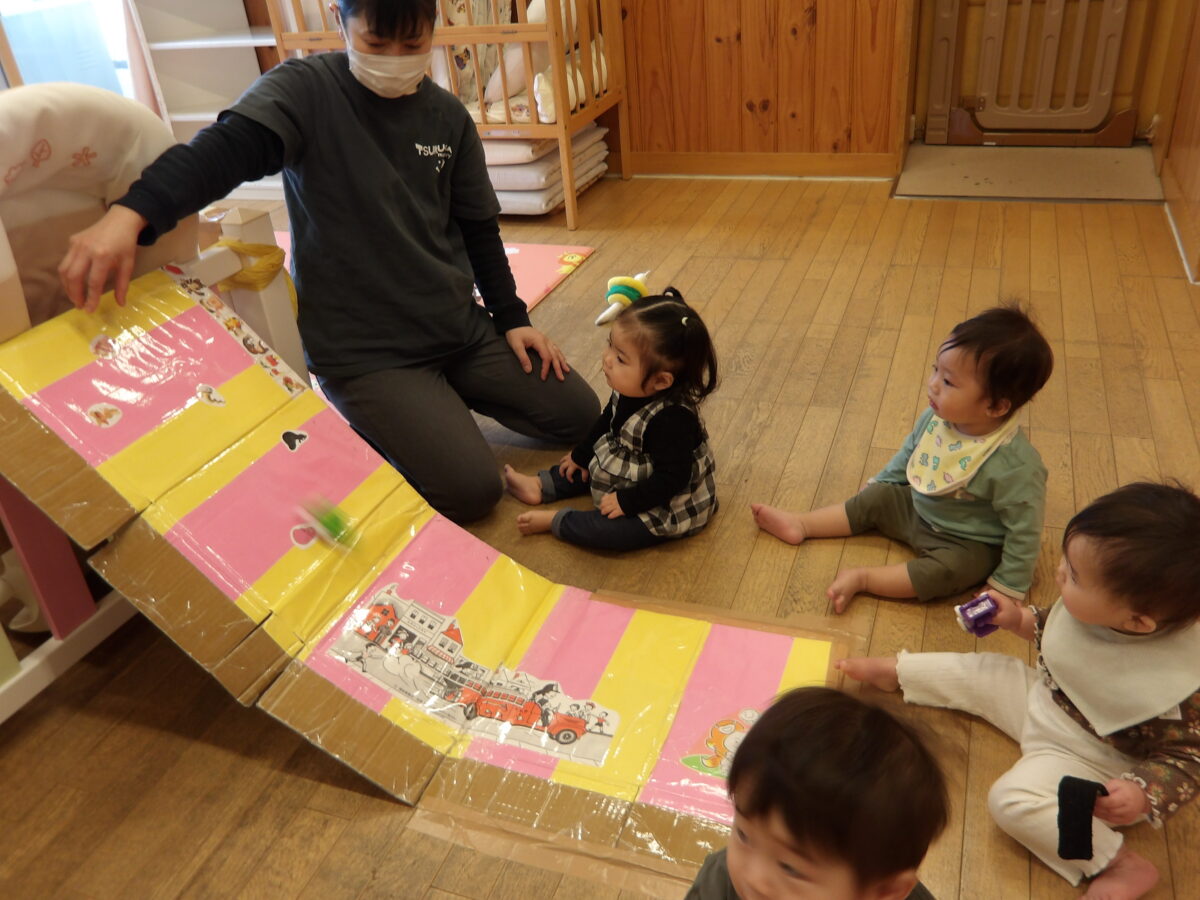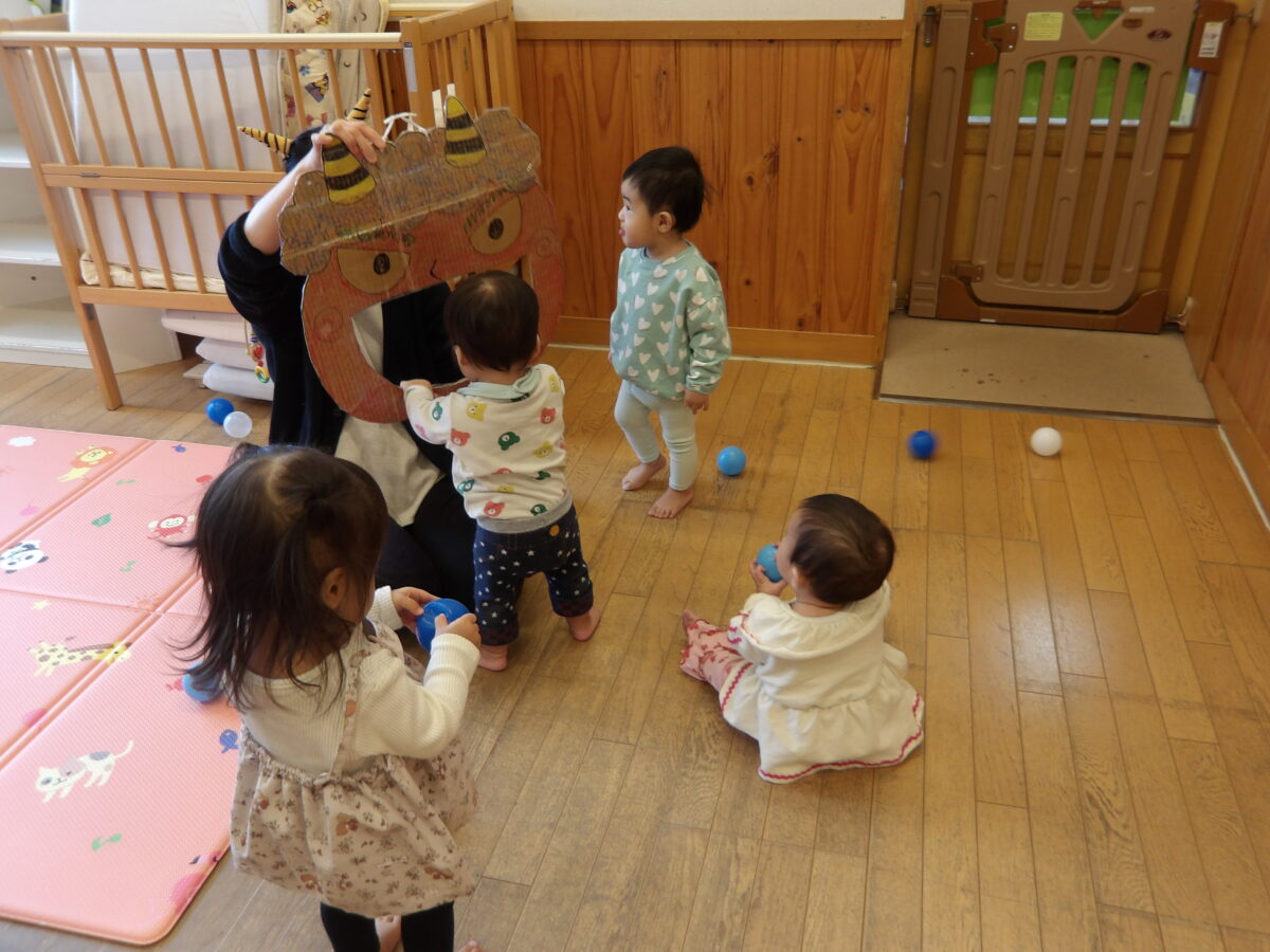 活動日記 DIARY 活動日記 もも組 1月 2026年2月1日 段ボールの鬼の口に、ボールを入れて遊びました。 ”えいっ!”と、繰り返し投げて楽しんでいました。 鬼のお面作りをしました。 上手にクレヨンをもって、ぐるぐる~!と描いていました。 斜面を作って車を走らせると、興味津々のこどもたち。 車を目で追ったり、真似をして車を走らせたりしていました。 新しい記事へ古い記事へ 活動日記一覧に戻る