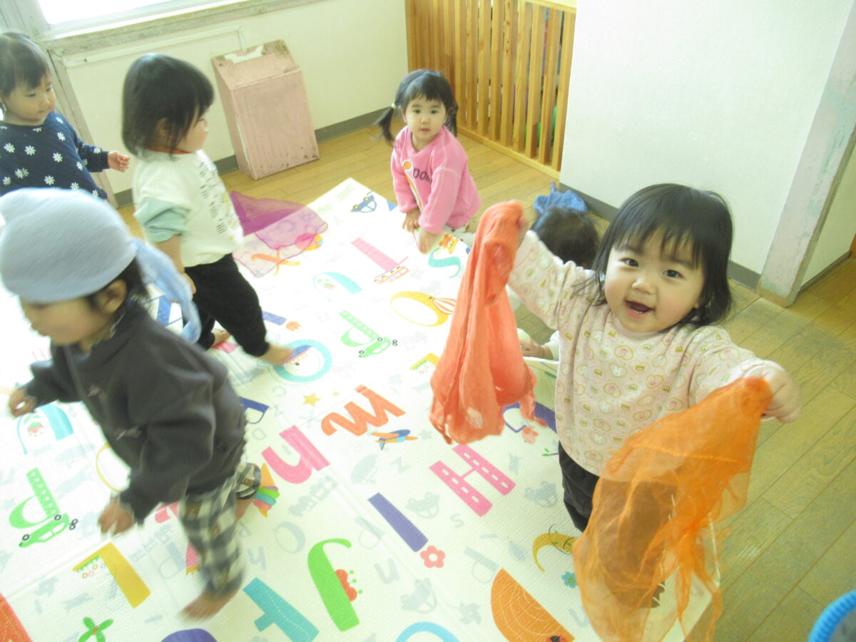 布を使って、いないいないばぁ!をしたり、いろいろな遊び方を見つけられるようになり、お友だちと一緒に楽しんでいます!