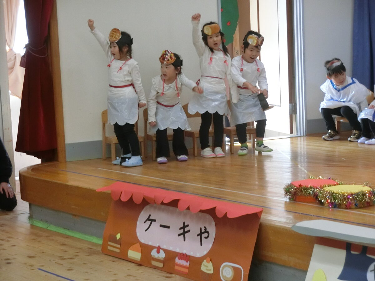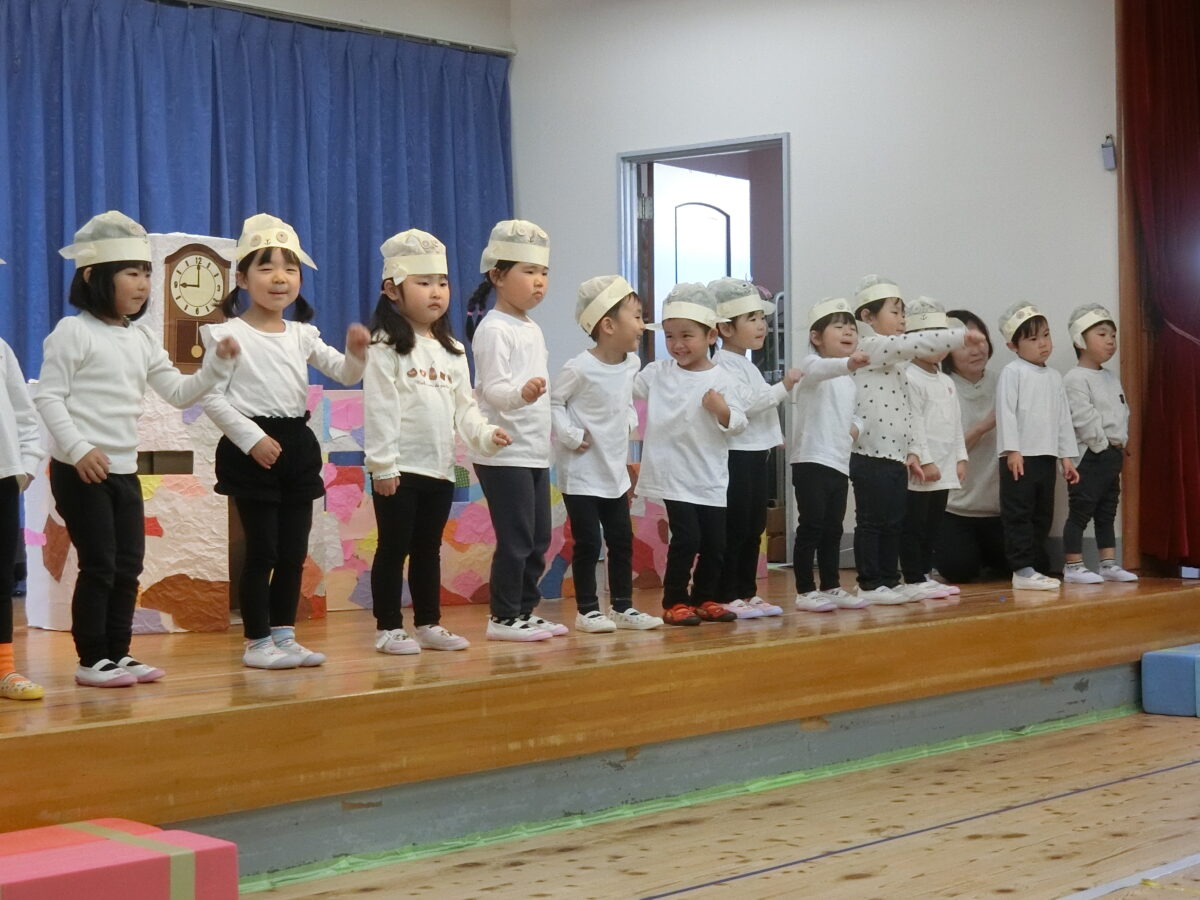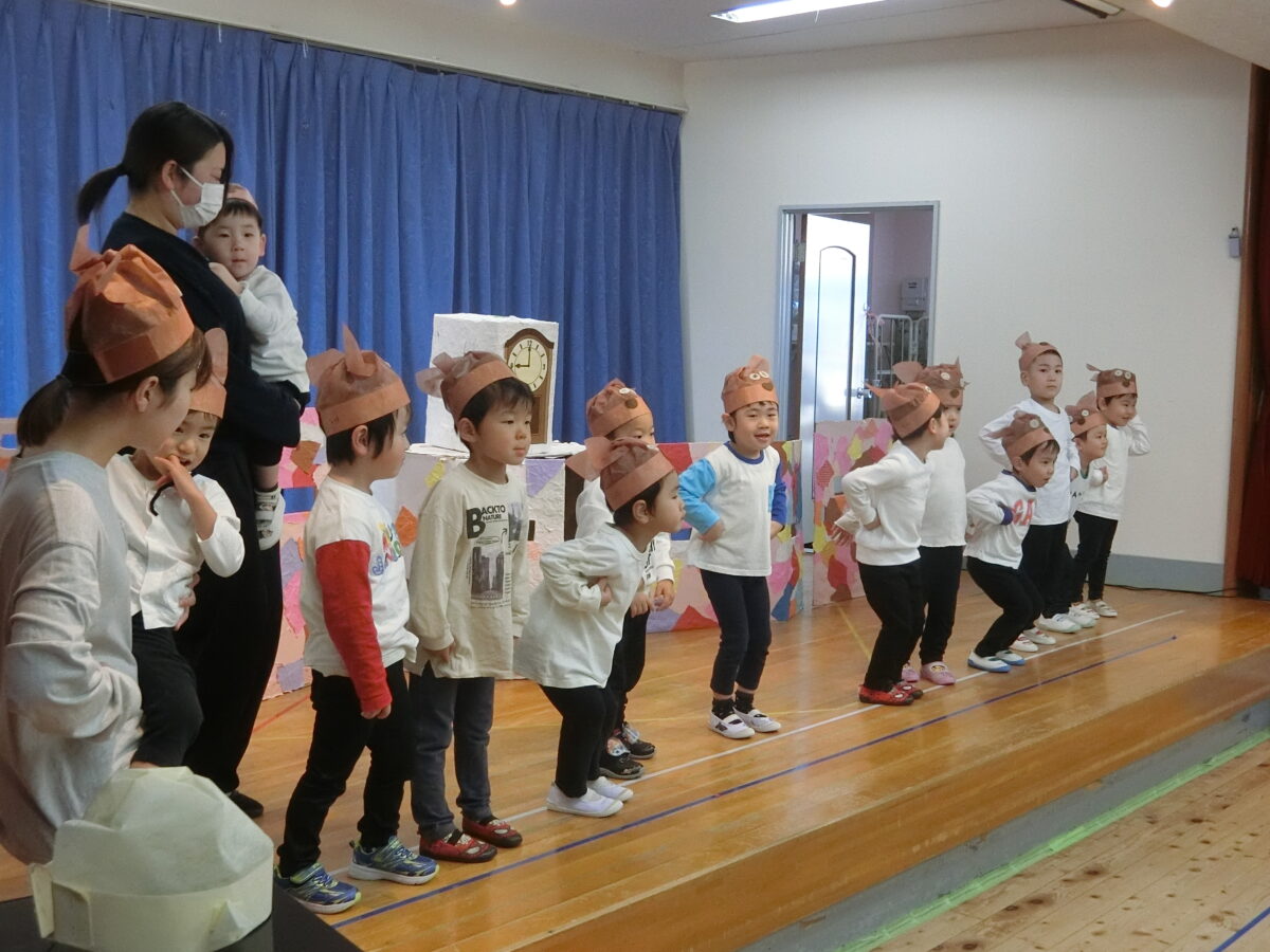 さくら組さんは保育園で初めての保育発表会でした。少しドキドキの表情の子もいましたが、劇遊び「おおかみとこやぎ」では園長先生がお母さんやぎで登場!!言葉の掛け合いや手遊びなどを交え年少さんらしいかわいらしい発表でした。