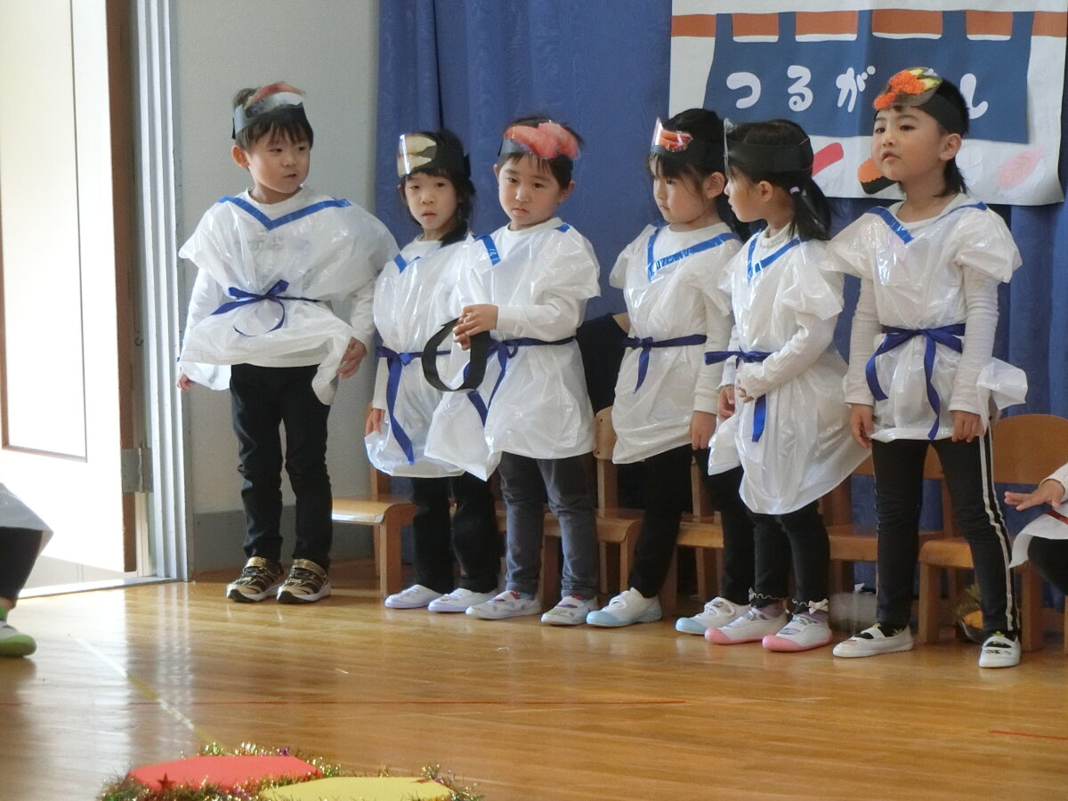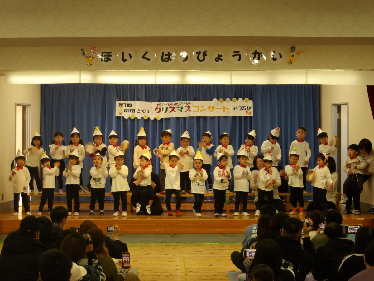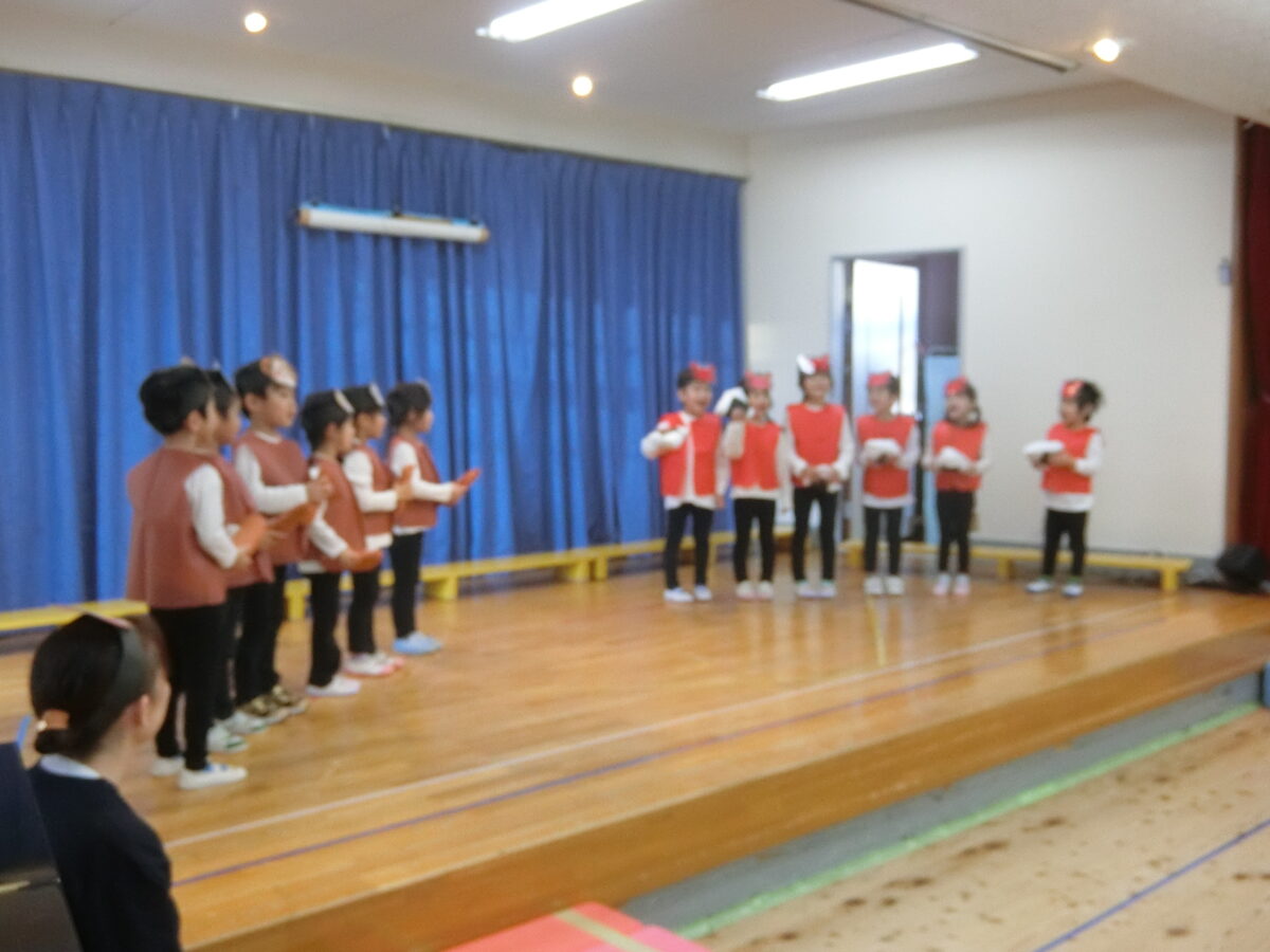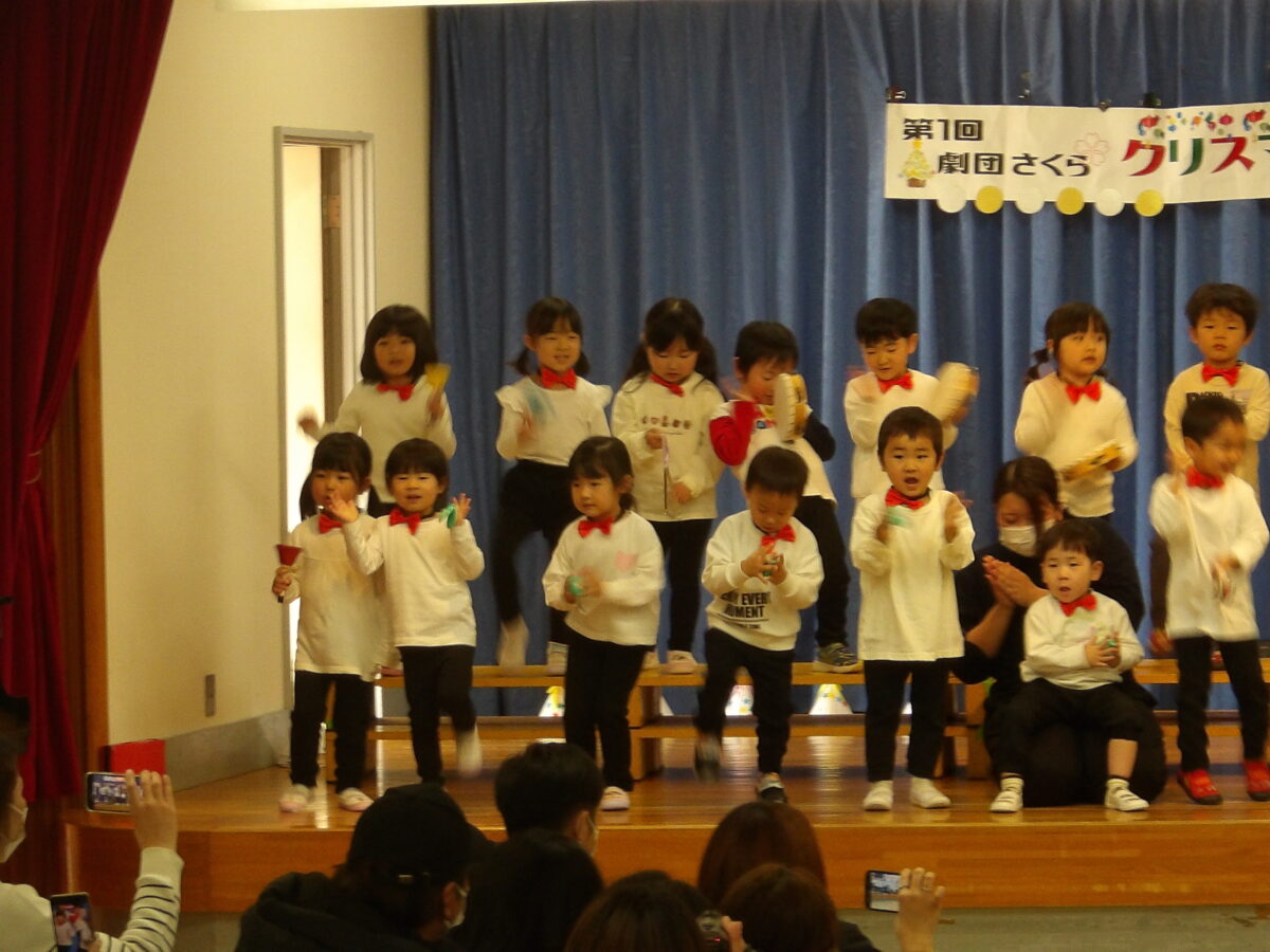 さくら組さんは保育園で初めての保育発表会でした。少しドキドキの表情の子もいましたが、劇遊び「おおかみとこやぎ」では園長先生がお母さんやぎで登場!!言葉の掛け合いや手遊びなどを交え年少さんらしいかわいらしい発表でした。