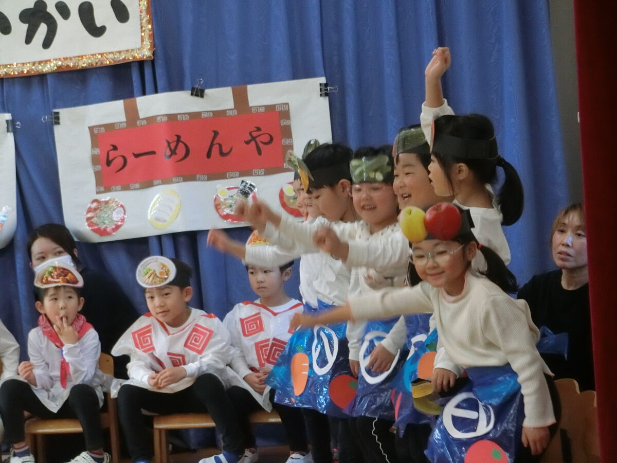 言葉あそび「たべものやさんしりとりたいかいかいさいします」!!たくさんの食べ物の名前でなが~くしりとりを続け、優勝はメニューが一番少なかったラーメンやさん!!最後まで諦めないことの大切さを子どもたちは学んだようです。