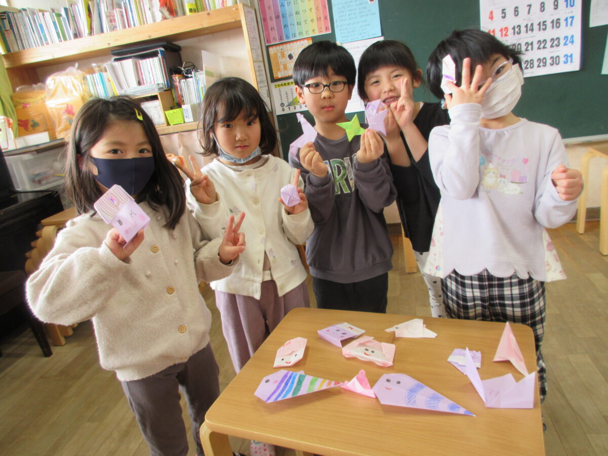 1月20日(火)劇団「風の子」さんによる観劇『たっくんと折り紙おじさん』がありました。折り紙で作られる楽器や動物から楽しいお話が繰り広げられ、「次は何かな~」と、子どもたちもわくわくドキドキ! お話の世界に引き込まれながら楽しんでいました。折り紙の魅力が高まり、折り紙ブームが再来しそうです。